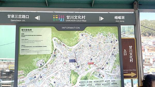 「甘川洞文化村」附近沒有地鐵站,「土城站」是離它最近的地鐵站,從「土城站」走 六號出口,就會看到往「甘川文化村」的指標,就順著路直接右轉,