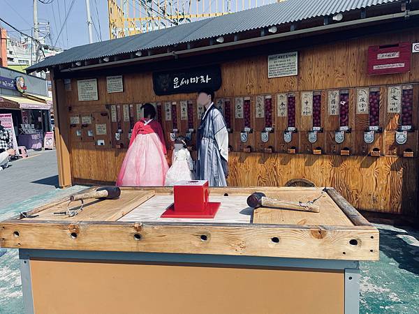 在入口處附近的3個人形立牌,身上是手繪甘川的圖案,