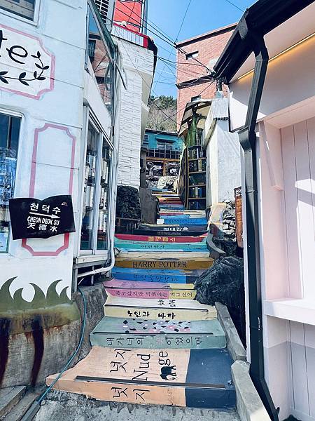 這個隱藏在店家之間的七彩階梯,也是另一個觀光客們必拍的重點,一層一層的階梯也是一本一本的書,裡面不乏有大家耳熟能詳的元素,